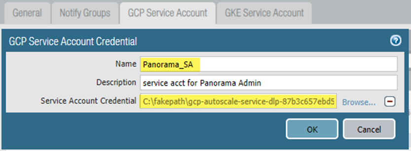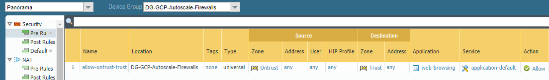 ![]() Return to your template stack and the virtual router you created earlier. Place the untrust and trust interfaces (ethernet1/1 and ethernet1/2) in the virtual router, and click OK. Return to your template stack and the virtual router you created earlier. Place the untrust and trust interfaces (ethernet1/1 and ethernet1/2) in the virtual router, and click OK.![]() Configure Stackdriver for your auto scaling deployment.You must have the VM-Series plugin on Panorama to configure Stackdriver. Configure Stackdriver for your auto scaling deployment.You must have the VM-Series plugin on Panorama to configure Stackdriver.- In the Device context, select the template stack you created earlier from the Template drop menu.Select DeviceVM-SeriesGoogle and click the Edit cog (). Enable Publish PAN-OS metrics to Stackdriver.![]()  ![]() Commit your changes.Create a Device Group that references the template or template stack you created in step 1.This Device Group will contain the VM-Series firewalls you create with the firewall template. Commit your changes.Create a Device Group that references the template or template stack you created in step 1.This Device Group will contain the VM-Series firewalls you create with the firewall template.- Add a security policy that allows web-browsing traffic from Untrust to Trust.In the Policies context, select the Device Group you just created. Select SecurityPre Rules and Add the following security policy.![]() Set up the GCP service account for the host project. Set up the GCP service account for the host project.- In the Panorama context, expand Google Cloud Platform, select Setup, and click Add.Supply a name and description for the host service account you created in Step 4.Upload the JSON credentials file you created in Step 4.4.![]() After you add a service account credential, you can validate the credential from your Panorama command line (you cannot validate from the web interface): After you add a service account credential, you can validate the credential from your Panorama command line (you cannot validate from the web interface):request plugins gcp validate-service-account gcp_service_account <svc-acct-credential-name>Set up auto scaling on the Panorama plugin for GCP.- In the Panorama context, expand Google Cloud Platform, select AutoScaling, and click Add.Supply the Firewall Deployment Name and an optional description for the deployment.For the GCP Service Account Credential, supply the GCP service account name from Step 8.![]() Chose the Device Group you created in Step 7, and the Template Stack you created in Step 1.Disable License Management Only to ensure traffic is secured.Commit your changes. Chose the Device Group you created in Step 7, and the Template Stack you created in Step 1.Disable License Management Only to ensure traffic is secured.Commit your changes.Prepare a VM-Series Firewall Bootstrap Package for Auto ScalingDuring bootstrap, the initial request from the firewall provides the host IP address and serial number, and the VM auth key so Panorama can validate the VM auth key and add the firewall as a managed device. Panorama can then assign the firewall to the appropriate device group and template so that you can centrally configure and administer the firewall using Panorama.In this case, you must generate a VM auth key on Panorama and include the key in the init-cfg.txt file that you use for bootstrapping. The VM auth key allows Panorama to authenticate the newly bootstrapped VM-Series firewall. The bootstrap package must include.- In the /config directory, an init-cfg.txt file that includes the Panorama IP address