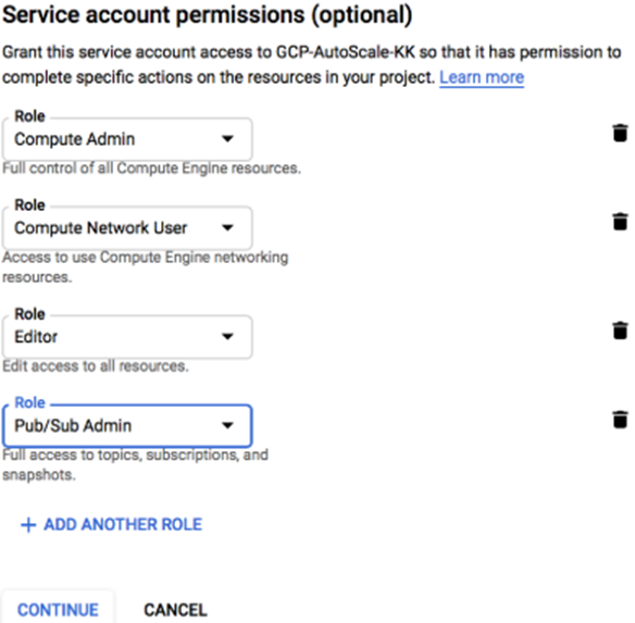 - Give the service account permission to auto-scale resources in this project.Select a role type from the drop menu, and on the right, select an appropriate access level. For example, select Project > Editor. You can select multiple roles for a service account.- Compute Engine > Compute Admin