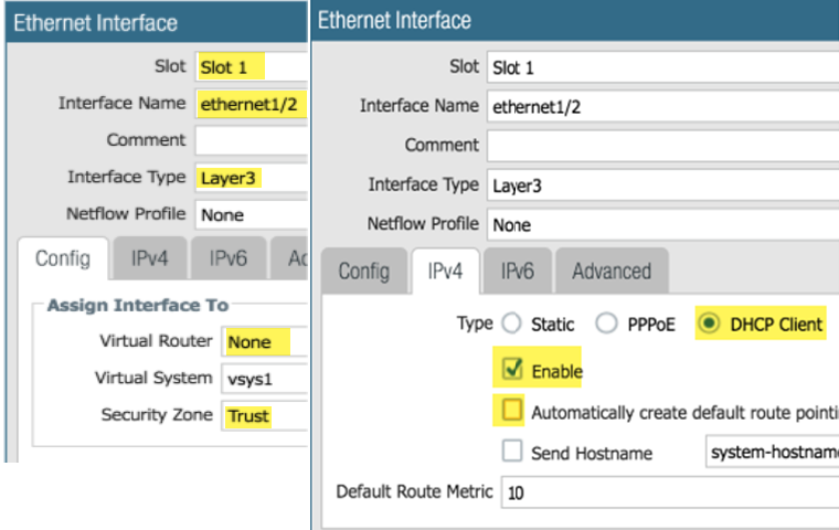 ![]() Add the ethernet1/2 (Trust) Layer 3 interface. Add the ethernet1/2 (Trust) Layer 3 interface.- On the Config tab, chose the same slot as the previous step, select the Interface name (ethernet1/2), and select the Layer3 Interface Type. From the Security Zone menu, select New Zone name the zone Trust and click OK.