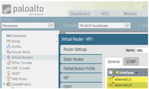 (optional) In the CLI, ensure you can communicate with your new host project.- Set your project to the host project you just created.gcloud set project <your-autoscale-host-project-name>Create a configuration for auto scaling. Your new configuration is automatically activated unless you disable activation.gcloud config configurations create <CONFIGURATION_NAME> gcloud config listObtain a Licensing API KeyYou need a Licensing API key so Panorama can license and de-license managed assets in GCP.- Log in to the Support portal and selectAssetsLicensing API and click Enable. The key is displayed.Only a Super User can view the Enable link to generate this key. See How to Enable, Regenerate, Extend the Licensing API Key.![]() Select the key and copy it.From the CLI, SSH in to Panorama and issue the following command, replacing <key> with the API key you copied from the support portal: Select the key and copy it.From the CLI, SSH in to Panorama and issue the following command, replacing <key> with the API key you copied from the support portal:request license api-key set key <key>API Key is successfully setConfigure the Panorama Plugin for GCP to Secure an Auto Scaling DeploymentIn Panorama, create assets to support the auto scaling firewall deployment.- Create a template, and a template stack that includes the template, and Commit the changes.![]() In the Network context, select either the template or the template stack. Select Virtual Routers and Add a virtual router.When the firewall template creates static routes, they are added to this virtual router.Define only one router for the auto scale deployment. In the Network context, select either the template or the template stack. Select Virtual Routers and Add a virtual router.When the firewall template creates static routes, they are added to this virtual router.Define only one router for the auto scale deployment.![]() In the Network context, select the template you created, select Interfaces and Add Interface. In the Network context, select the template you created, select Interfaces and Add Interface.- On the Config tab, select a slot, select the Interface name and select the Layer3 Interface Type. From the Security Zone menu, select New Zone, name the zone Untrust and click OK.