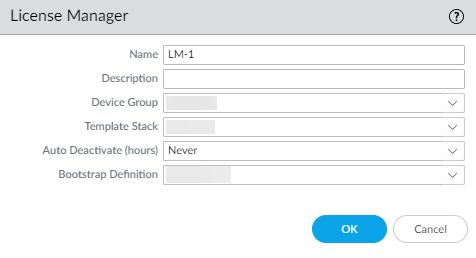 Configure a License Manager.- Select PanoramaSW Firewall LicenseLicense Managers.Click Add.Enter a descriptive Name to identify the License Manager.(Optional) Enter a Description of the License Manager.Select a Device Group from the drop-down. When a VM-Series firewall bootstrapped using the license manager connects to Panorama, it is placed in the specified device group.Select a Template Stack from the drop-down. When a VM-Series firewall bootstrapped using the license manager connects to Panorama, it is placed in the specified template Stack.In the Auto Deactivate field, specify the amount of time, in hours, that Panorama waits before deactivating the license of a disconnected VM-Series firewall. When you select Never, Panorama does not deactivate a disconnected VM-Series firewall. Auto Deactivate is set to Never by default. You can set the deactivation time, in hours, from one to 24.Before deactivating, set the API key using:request license api-key set key <key>When an Auto Deactivate interval is configured, the plugin might also deactivate the license of stopped VM-Series firewalls in addition to disconnected firewalls.Select a Bootstrap Definition from the drop-down. The selected bootstrap definition specifies the auth code used by Panorama to license the VM-Series firewalls associated with the license manager.Click OK.Commit your changes.