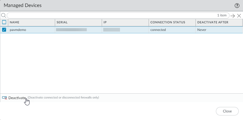 (Optional) View and deactivate a managed VM-Series firewall. From the Show Devices dialogue, you can view the devices associated with a given license manager. You can view the name, serial number, management IP address, connection status, and amount of time Panorama waits to deactivate a disconnected firewall. Additionally, you can manually deactivate the license of managed VM-Series firewall.- Select PanoramaSW Firewall LicenseLicense Managers.In the Action column of a given license manager, click Show Devices.To manually deactivate a connected or disconnected (but not yet deactivated) managed VM-Series firewall, select a one or more listed VM-Series firewalls and click Deactivate.