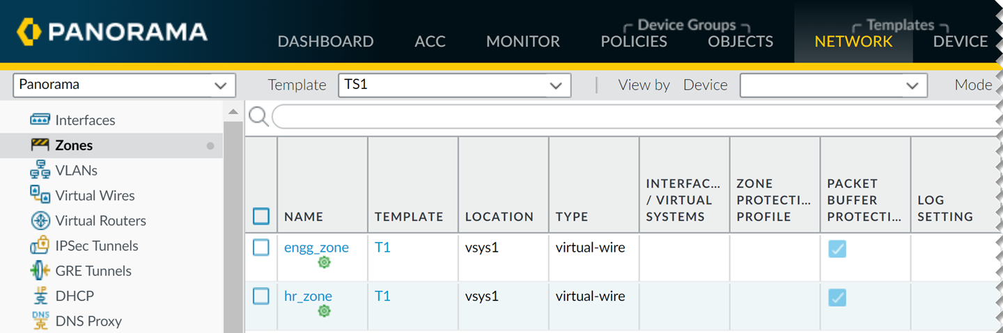 - Add a device group or a device group hierarchy.- Select PanoramaDevice Groups, and click Add. You can also create a device group hierarchy.Enter a unique Name and a Description to identify the device group.Click OK.Click Commit and select Panorama as the Commit Type to save the changes to the running configuration on Panorama.Add a template.- Select PanoramaTemplates, and click Add.Enter a unique Name and a Description to identify the template.Click OK.Click Commit, and select Panorama as the Commit Type to save the changes to the running configuration on Panorama.Create a template stack.- Select PanoramaTemplates, and click Add Stack.Enter a unique Name and a Description to identify the template.Click OK.Click Commit, and select Commit to Panorama to save the changes to the running configuration on Panorama.Create the zone(s) for each template.Each zone is mapped to a service profile on NSX-T Manager. To qualify, a zone must be of the virtual wire type and a template associated with a service definition.You can add up to 32 zones in each template.- Select NetworkZones.Select the correct template in the Template drop-down.Select Add and enter a zone Name.Set the interface Type to Virtual Wire.Click OK.Verify that the zones are attached to the correct template.![]() Click Commit, and select Panorama as the Commit Type to save the changes to the running configuration on Panorama.Panorama creates a corresponding service profile on NSX-T Manager for each qualified zone upon commit.Update the DNS and NTP server information of your template stack. You must complete this step if you are using device certificates in your deployment. This is required to ensure the firewalls deployed in your NSX-T environment have the correct DNS information needed to reach the device certificate server. Click Commit, and select Panorama as the Commit Type to save the changes to the running configuration on Panorama.Panorama creates a corresponding service profile on NSX-T Manager for each qualified zone upon commit.Update the DNS and NTP server information of your template stack. You must complete this step if you are using device certificates in your deployment. This is required to ensure the firewalls deployed in your NSX-T environment have the correct DNS information needed to reach the device certificate server.- Verify that you specified the correct template stack from the Template drop-down.Select DeviceSetupServices and click the Edit icon.On the Services tab, enter the IP address of the Primary DNS Server and Secondary DNS Server.On the NTP tab, enter the IP address of the NTP Server.Click OK.Commit your changes to Panorama.