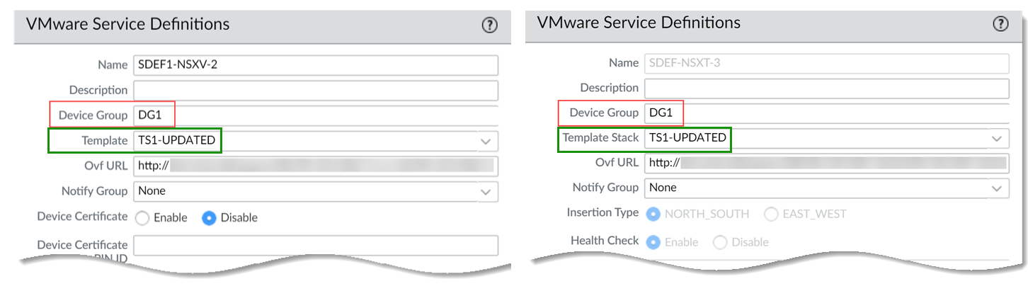 - Install the Panorama Plugin for VMware NSX 3.2.0 or later. See the Panorama Plugin for VMware NSX 3.2.0 Release Notes before upgrading.Configure an NSX-T service definition for each NSX-V service definition in your deployment. Do not create new device groups; instead use your existing NSX-V device groups. Using the existing device groups allows you to apply the same security policy rules used on NSX-V to the VM-Series firewalls deployed on NSX-T. If you have policy that reference a particular zone, add the same template stack from your NSX-V service definition to your NSX-T service definition. Additionally, if your device group references a particular template, ensure that you select the template stack that includes the template referenced in the device group.![]() Configure an NSX-T service manager and associate the NSX-T service definitions to the service manager. Configure an NSX-T service manager and associate the NSX-T service definitions to the service manager.![]() Prepare your NSX-T environment and deploy the VM-Series firewall. You must create your security groups, service chains, and traffic redirection policy before launching the VM-Series firewall.Add the NSX-T tags to you existing dynamic address groups. Prepare your NSX-T environment and deploy the VM-Series firewall. You must create your security groups, service chains, and traffic redirection policy before launching the VM-Series firewall.Add the NSX-T tags to you existing dynamic address groups.- Select PanoramaObjectsAddress Groups.Click on the name of an existing NSX-V dynamic address group.Click Add Match Criteria to display the tags from NSX-V and NSX-T.Add the NSX-T tag to the dynamic address groups. Be sure to use the OR operator between the tags.When you have added all the necessary tags, click OK.Commit your changes.![]() After your VM workloads have successfully migrated from NSX-V to NSX-T, you remove the NSX-V tags from your dynamic address groups if you plan to discontinue use of NSX-V. All NSX-V tags and corresponding IP addresses are unregistered after all NSX-V related configuration is removed from the Panorama plugin for NSX and VM-Series firewall configuration is removed from NSX-V manager. After your VM workloads have successfully migrated from NSX-V to NSX-T, you remove the NSX-V tags from your dynamic address groups if you plan to discontinue use of NSX-V. All NSX-V tags and corresponding IP addresses are unregistered after all NSX-V related configuration is removed from the Panorama plugin for NSX and VM-Series firewall configuration is removed from NSX-V manager.
