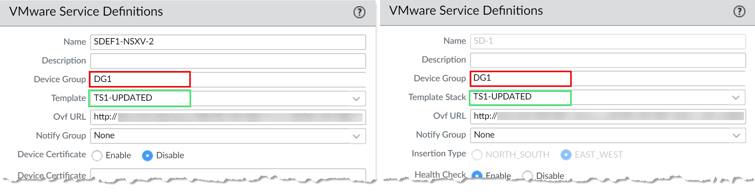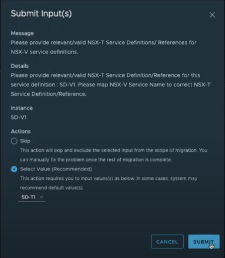 - Prepare your NSX-V and NSX-T environments for migration based on the steps described by VMware.Install the Panorama Plugin for VMware NSX 3.2.0 or later. See the Panorama Plugin for VMware NSX 3.2.0 Release Notes before upgrading.Enable Communication Between NSX-T Manager and Panorama.Configure an NSX-T service definition for each NSX-V service definition in your deployment. Do not create new device groups; instead use your existing NSX-V device groups. Using the existing device groups allows you to apply the same security policy rules used on NSX-V to the VM-Series firewalls deployed on NSX-T. If you have policy that reference a particular zone, add the same template stack from your NSX-V service definition to your NSX-T service definition. Additionally, if your device group references a particular template, ensure that you select the template stack that includes the template referenced in the device group.![]() Configure an NSX-T service manager and associate the NSX-T service definitions to the service manager. Configure an NSX-T service manager and associate the NSX-T service definitions to the service manager.![]() Verify that your NSX-T configuration is present on NSX-T Manager. Verify that your NSX-T configuration is present on NSX-T Manager.- Log in to NSX-T Manager.Select SystemService DeploymentsCatalog.Confirm that your NSX-T service definition is listed.Select SecurityNetwork Introspection SettingsService Profiles.Confirm that your zones associated with your NSX-T template are listed.If you have not already done so, add a compute manager in NSX-T Manager. After you have verified that the Registration Status and Connection Status are up, continue below.Import the NSX-V configuration to NSX-T.Uninstall the service instance from NSX-V.This step will result in traffic disruption.- Log in to your vSphere client.Select Installation and UpgradeService Deployment.Select your service deployment.Click Delete.Click Delete to confirm.Resolve Configuration issues on NSX-T Manager. While resolving configuration issues, you must take specific actions to migrate your VM-Series firewall configuration. In most cases, you can accept the recommendations presented by NSX-T Manager.- When resolving service insertion configuration, verify that you selected the correct service definition that you previously configured on Panorama for the VM-Series on NSX-T.![]() Continue resolving the remaining configuration.Before moving to Migrate Configuration, you will be asked to provide a transport zone for the service insertion.Map the service profiles on NSX-V to the corresponding service profiles on NSX-T. Continue resolving the remaining configuration.Before moving to Migrate Configuration, you will be asked to provide a transport zone for the service insertion.Map the service profiles on NSX-V to the corresponding service profiles on NSX-T.- Auto_PAN_VendorTPL can be skipped.![]()
