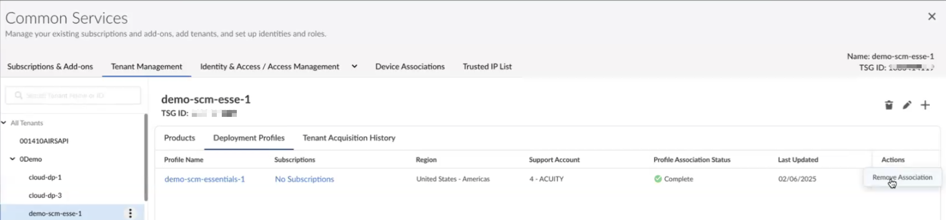 To remove a deployment profile from a TSG: - On the hub, go to Common Services > Tenant Management > Deployment Profiles.Click the ellipses (⋮) next to the deployment profile you want to remove the association and click Remove Association.
