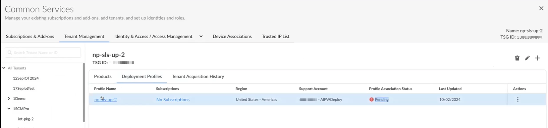 You will be prompted with authentication to SSO after which you will view the Activate Subscriptions based on the deployment profiles page.Login to the HUB with your SSO.Click Subscriptions and Add-ons and click the tenant in which your deployment profile is created. You will view the Activate Subscriptions based on Deployment Profiles page.Select the Customer Support Portal account that you are subscribed to.Select or Create the required tenant and the region it belongs to.Select the deployment profile that you wish to associate with the selected tenant. You can also search for the deployment profile using its name or auth code.If you have not subscribed to any of the cloud services, you will still be able to view the deployment profile in this section.The status of the deployment profiles is listed as Available or Not available and the required dependency to make the deployment profile available is also listed. The Deployment Profiles listed as available can be associated with the tenant.The deployment profiles listed as Not available might have a missing or a conflicting service under the selected tenant. For example, if you have a deployment profile with Strata Cloud Manager Pro subscription that is associated with a TSG, and another deployment profile with AIOps subscription, the deployment profiles will be listed as available. However, you won't be able to activate the deployment profile with AIOps under the same TSG, and this will result in an error due to conflicting services. If you have a deployment profile with Strata Cloud Manager Pro, then you must not associate some profiles with Strata Cloud Manager Pro, some with Strata Logging Service and some with no subscription. Ensure that you associate all the profiles with Strata Cloud Manager Pro.(optional) Select the Additional Services that you would like all your flex firewall devices to be associated with. You can either select the required Cloud Identity Engine service or create a new one.