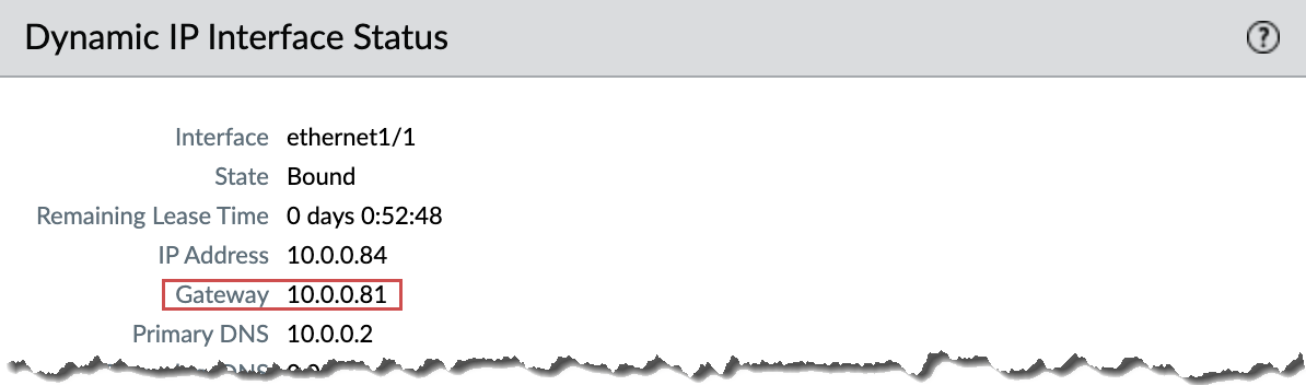 - For Next Hop, select IP Address and enter the IP address of the gateway of the trust interface. You can find the gateway IP address on NetworkInterfacesEthernetDynamic-DHCP Client.![]()
