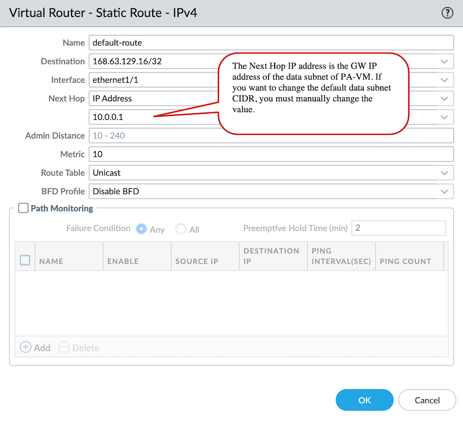 - Create a static route on the VM-Series firewall.- On the VM-Series firewall web interface, select NetworkVirtual Routers and select the virtual router associated with the data interface.