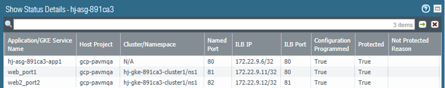 View the Deployment Status from the CLIYou can use the Panorama CLI to manage deployed applications. The command line actions parallel those described in View the Onboarded Application in the Panorama Plugin for GCP. In the following commands, the autoscaling_name is the Firewall Deployment Name you entered in the auto scaling configuration.- List the onboarded (protected) applications.show plugins gcp show-protected-apps autoscaling_name <fw-deployment-name>