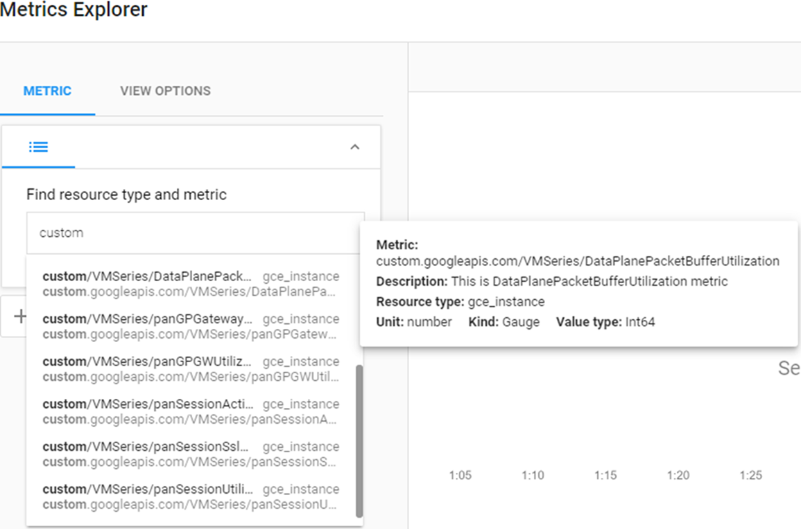 Commit your changes.Wait until the firewall starts to publish metrics to Stackdriver before you configure alarms for PAN-OS metrics.Verify that you can see the metrics on Stackdriver.- In the Google Cloud Console, select Products and ServicesMonitoring.In Stackdriver, choose ResourcesMetrics Explorer.In the Find resource type and metric section, enter custom in the search field to filter the PAN-OS metrics.