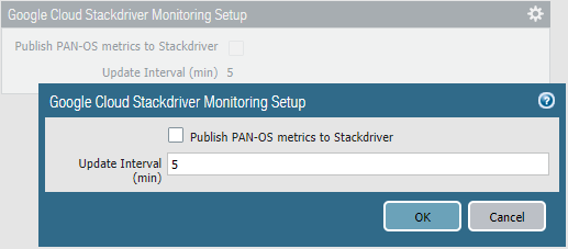 - Set the Update Interval (range is 1 - 60 minutes; default is 5). This is the frequency at which the firewall publishes the metrics to Stackdriver.