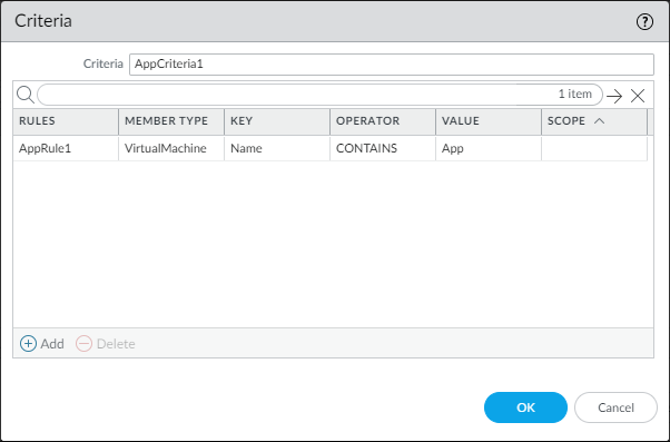 On the Dynamic Address Group window, click OK to finish or Add to create additional criteria (up to five total) and rules.