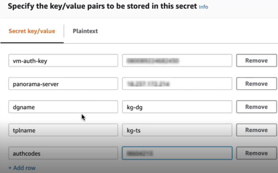 # aws secretsmanager get-secret-value --secret-id My_bootstrap { "ARN": "arn:aws:secretsmanager:us-east-1:688382******: secret:My_bootstrap", "Name": "My_bootstrap", "VersionId": "01b6853d-e187-479f-***********", "SecretString": "{\"mgmt-interface-swap\":\"enable\", \"vm-auth-key\":\"AAA\",\"panorama-server\":\"10.*.*.1\", \"panorama-server-2\":\"10.*.*.2\",\"dgname\":\"dg-s0000h\", \"tplname\":\"tpl-santosh\",\"license-authcode\":\"AAAA\"}", "VersionStages": [ "AWSCURRENT" ], "CreatedDate": 1581018411.847 }