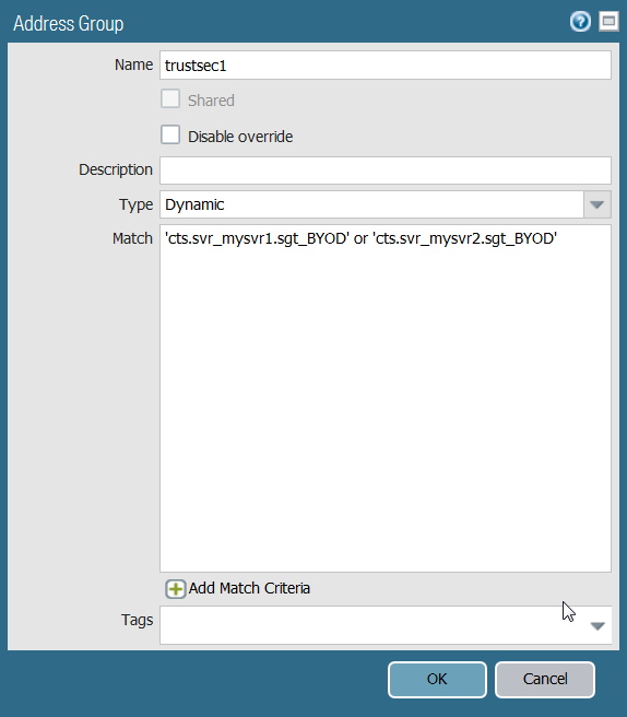 it to the dynamic address group.Panorama can only display security group tags it has learned from active sessions. Security group tags in live sessions appear in the match criteria list.