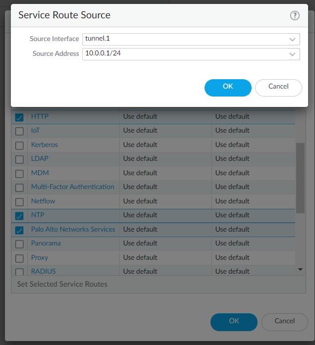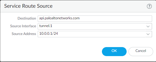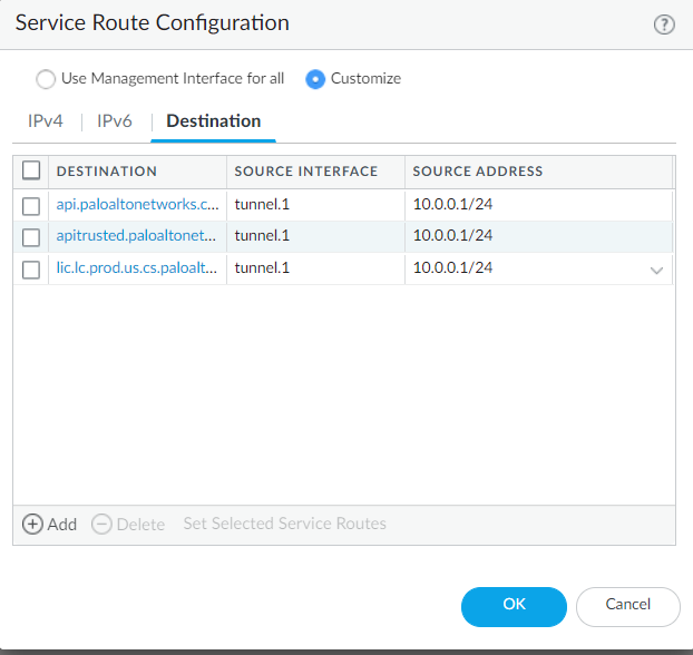 By default, the management interface is used to forward logs to Strata Logging Service. If you choose not to use the management interface, use a data interface by configuring destination service routes for the following FQDNs: api.paloaltonetworks.com, apitrusted.paloaltonetworks.com, lic.lc.prod.us.cs.paloaltonetworks.com,certificatetrusted.paloaltonetworks.com, certificate.paloaltonetworks.com.- Select DeviceSetupServicesGlobal. Global on a firewall without multiple virtual system (multi-vsys) capability.