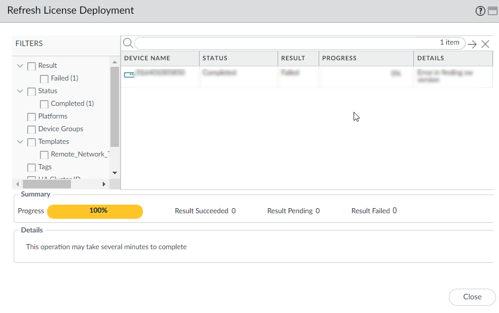 - From Panorama, select PanoramaDevice DeploymentLicense.First Refresh and then select the firewalls from the list. Panorama retrieves the licenses, deploys them to the selected firewalls, and updates the licensing status on the Panorama web interface. Make sure you see that Panorama successfully installed the Strata Logging Service license on the firewall.Do not Refresh again until the first refresh completes. When the refresh completes, you will see that Status shows Completed and Progress is 100%. There are also Details about whether the refresh succeeded.