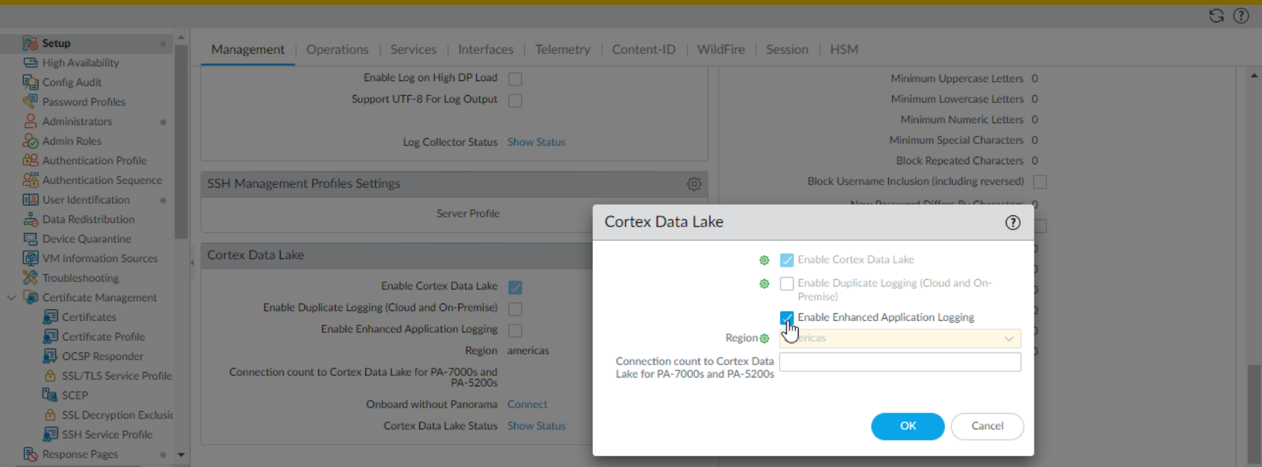 - Select DeviceSetupManagement and find the Cloud Logging settings.Enable Cloud Logging to connect the firewall to Strata Logging Service. If you want the firewall to collect data that increases visibility for Palo Alto Networks applications, you can also Enable Enhanced Application Logging.Strata Logging Service logging doesn’t start until after you’ve specified the log types you want to forward. Complete these steps and then start sending logs to Strata Logging Service.Do not Enable Duplicate Logging. This option applies only to Panorama-managed firewalls.Select the Region where you want to forward logs for the firewalls associated with this template and then click OK.This region is not necessarily where your firewalls are located but the location of the Strata Logging Service instance. They will send logs to the region of the Strata Logging Service instance to which you onboarded them.Specify the Connection count to Strata Logging Service for PA-7000s and PA-5200s.Specify the number of connections that are established between the firewalls and Strata Logging Service for forwarding logs to Strata Logging Service (range is 1 to 20; default is 5).Commit and push the config to firewalls.Click DevicesSetupManagementCloud LoggingShow Status to check the connection status. The status for License, Certificate, and Customer Info should be green.You can also use this command to check the certificate status along with other details related to Strata Logging Service:request logging-service-forwarding status