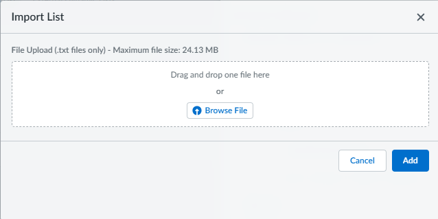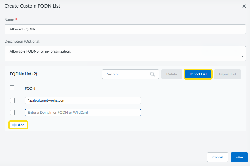 2. You can either + Add the FQDNs to be added to the FQDNs List or Import List of existing FQDNs supplied in a text (.txt) file managed by your organization.
