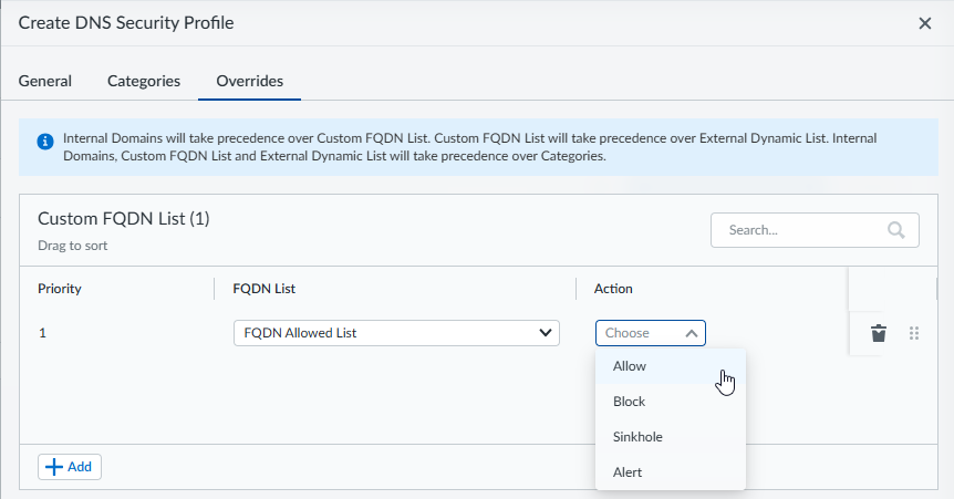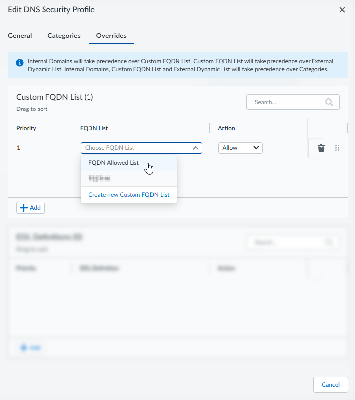 A custom FQDN list can be defined for use in DNS Security profiles for the Advanced DNS Security Resolver. Lists must include only FQDNs (Fully Qualified Domain Name) and can have a specific, group-level action configured when applied to a DNS Security profile.