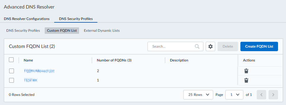 3. You can view your available custom FQDN lists and view the general information about each, including the number of FQDNs contained in a given list and a description. Additionally, you can delete or update each FQDN list that was previously added.