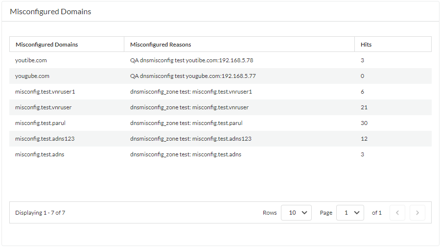 - Misconfigured Domains—View a list of non-resolvable domains associated with the user-specified public-facing parent domain(s). For each entry, there is a misconfiguration reason and a traffic hit count based on the source IP.