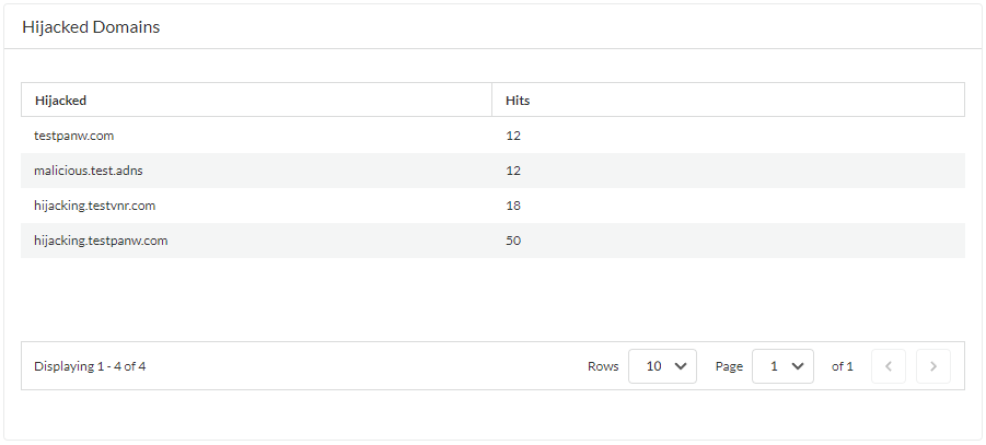 - Hijacked Domains—View a list of hijacked domains as determined by Advanced DNS Security. For each entry, there is a categorization reason and a traffic hit count based on the source IP.