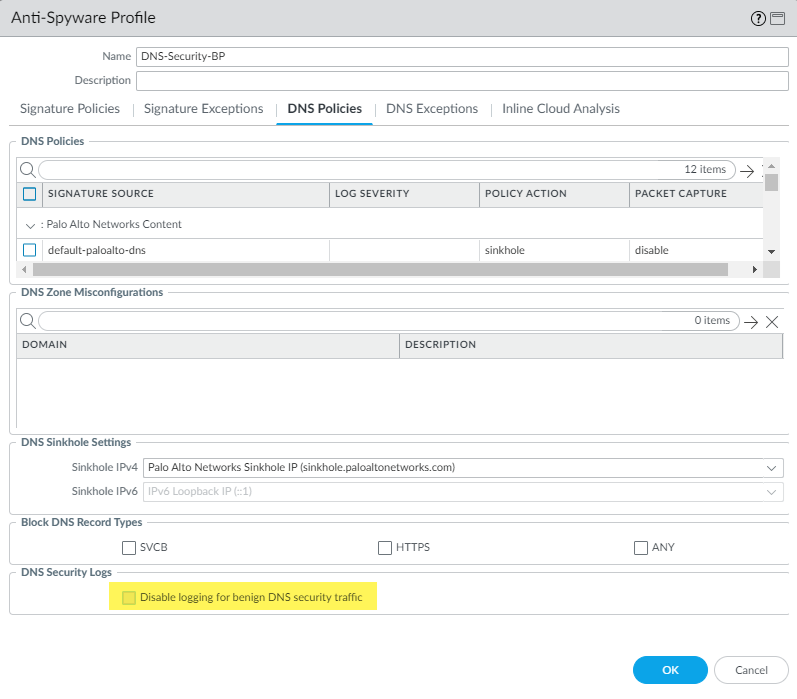 DNS Security log type, you can configure the firewall to generate logs for benign