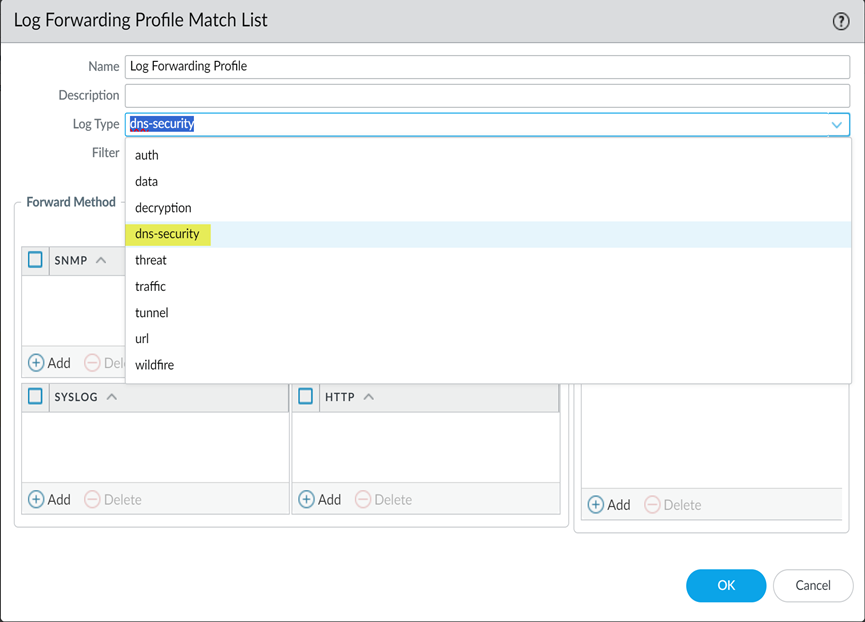 DNS Security supports a log type specifically tailored for DNS Security events to