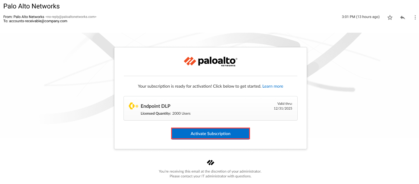 - Contact your Palo Alto Networks representative to purchase the Endpoint DLP subscription.Click the magic link provided to you by Palo Alto Networks when you purchased the Endpoint DLP subscription.Activate Subscription to begin activating Endpoint DLP.