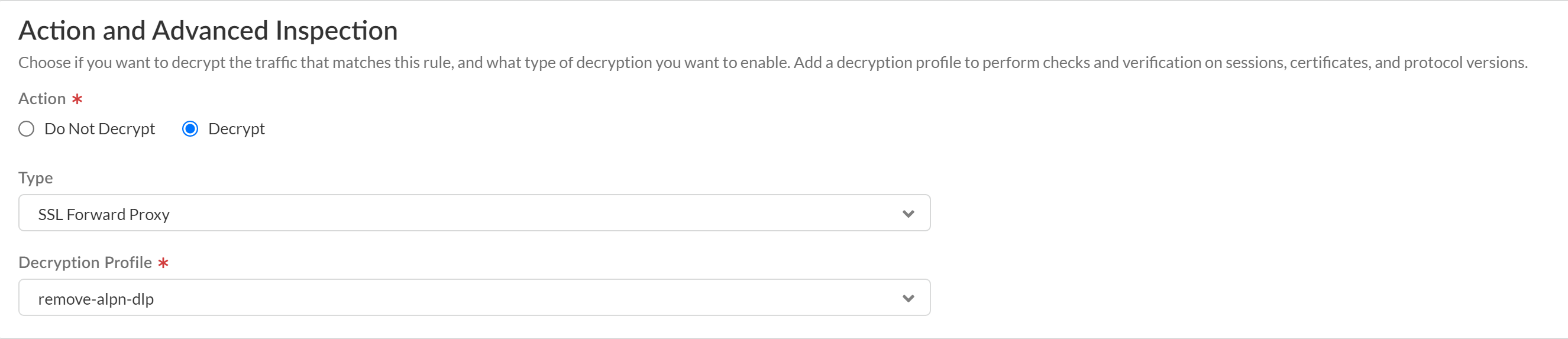 Save the decryption profile group.Create a decryption policy rule to decrypt traffic for Enterprise DLP inspection.Strata Cloud Manager includes the predefined Exclude Microsoft O365 Optimized Endpoints - IPs and Exclude Microsoft O365 Optimized Endpoints - URLs decryption rules that exclude Microsoft Office 365 from decryption.For Enterprise DLP to successfully inspect traffic for Microsoft Office 365, you must position this new decryption rule before the predefined decryption exclusion rules. Alternatively, you can Disable these rules or Delete them.- Select ConfigurationNGFW and Prisma AccessSecurity ServicesDecryption and Add Rule.Enter a descriptive Name and configure the decryption policy rule as needed.In the Action and Advanced Inspection section, configure the policy rule to Decrypt traffic that matches this rule.For the Type, select SSL Forward Proxy.Select the Decryption Profile you created to strip ALPN headers.