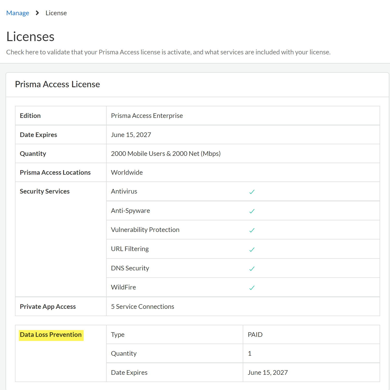 Review the Setup Prerequisites for Enterprise DLP and enable the required ports, Fully Qualified Domain Names (FQDN), and IP addresses on your network.This is required to forward traffic to Enterprise DLP for inspection and verdict rendering.Log in to Strata Cloud Manager.Verify that the Enterprise DLP license is active.- Select ConfigurationNGFW and Prisma AccessOverview and navigate to the Licenses widget.Click the license Quantity and confirm that the Data Loss Prevention license is active.Confirm the Data Loss Prevention license Type displays PAID and that an expiration date is displayed.