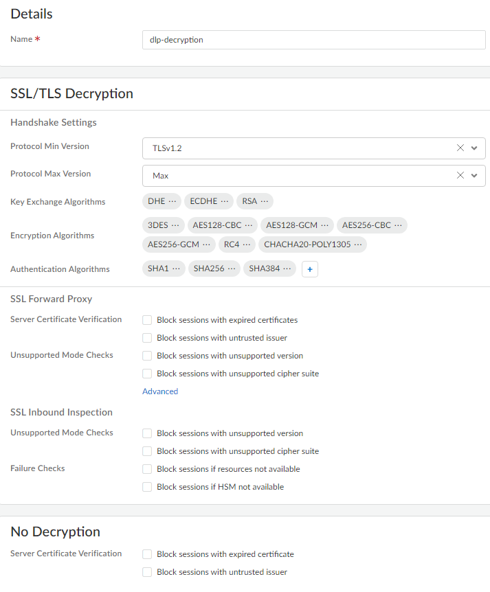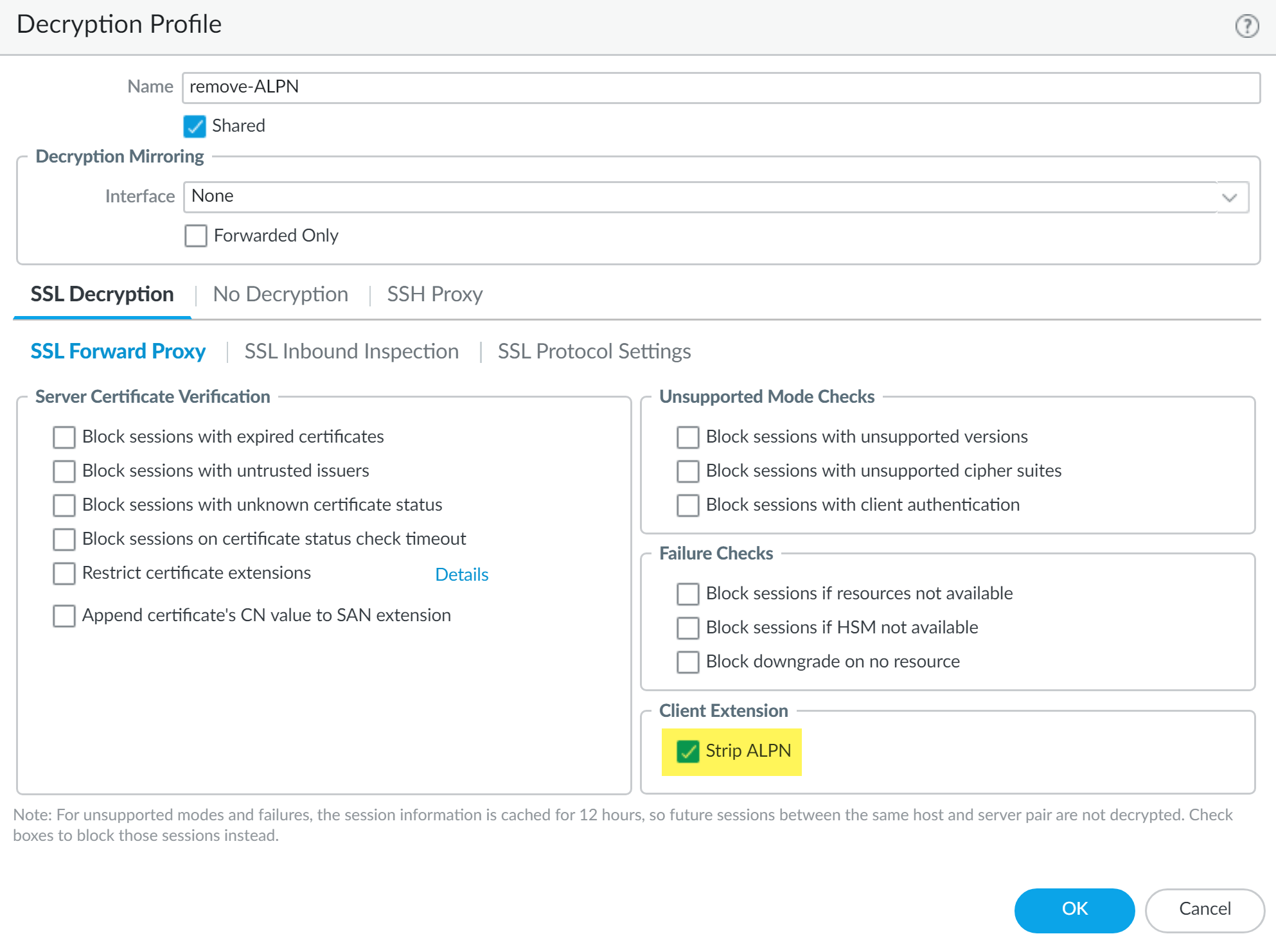 (Required for DLP 3.0.1 and earlier releases only) Create a decryption profile to remove application-layer protocol negotiation (ALPN) headers from uploaded files.Enterprise DLP supports HTTP/1.1. Some applications, such as SharePoint and OneDrive, support HTTP/2 for uploads by default. Strip ALPN is required to force applications using HTTP/2 to use HTTP/1.1 to make them compatible with Enterprise DLP.- Select ObjectsDecryptionDecryption Profile and specify the Device Group.Add a new decryption profile.Specify a descriptive Name.(Optional) Enable the Shared option to make this decryption profile available across all device groups.Select SSL Decryption SSL Forward Proxy and enable Strip ALPN in the Client Extension.Click OK.