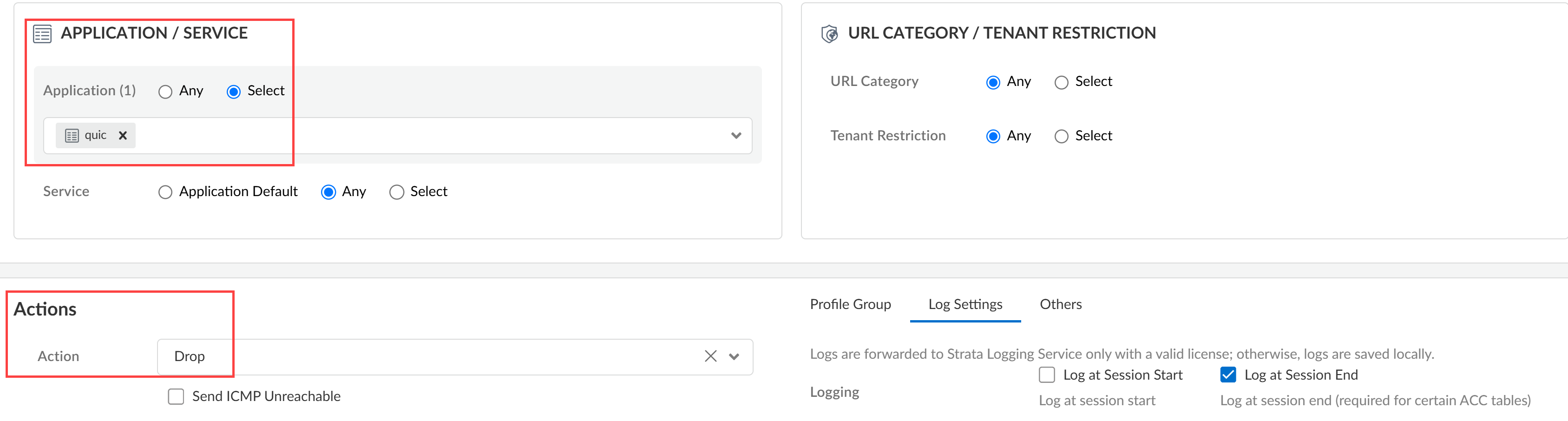 - In the Application/Service section, click Select for the Application field. Search for and select quic.