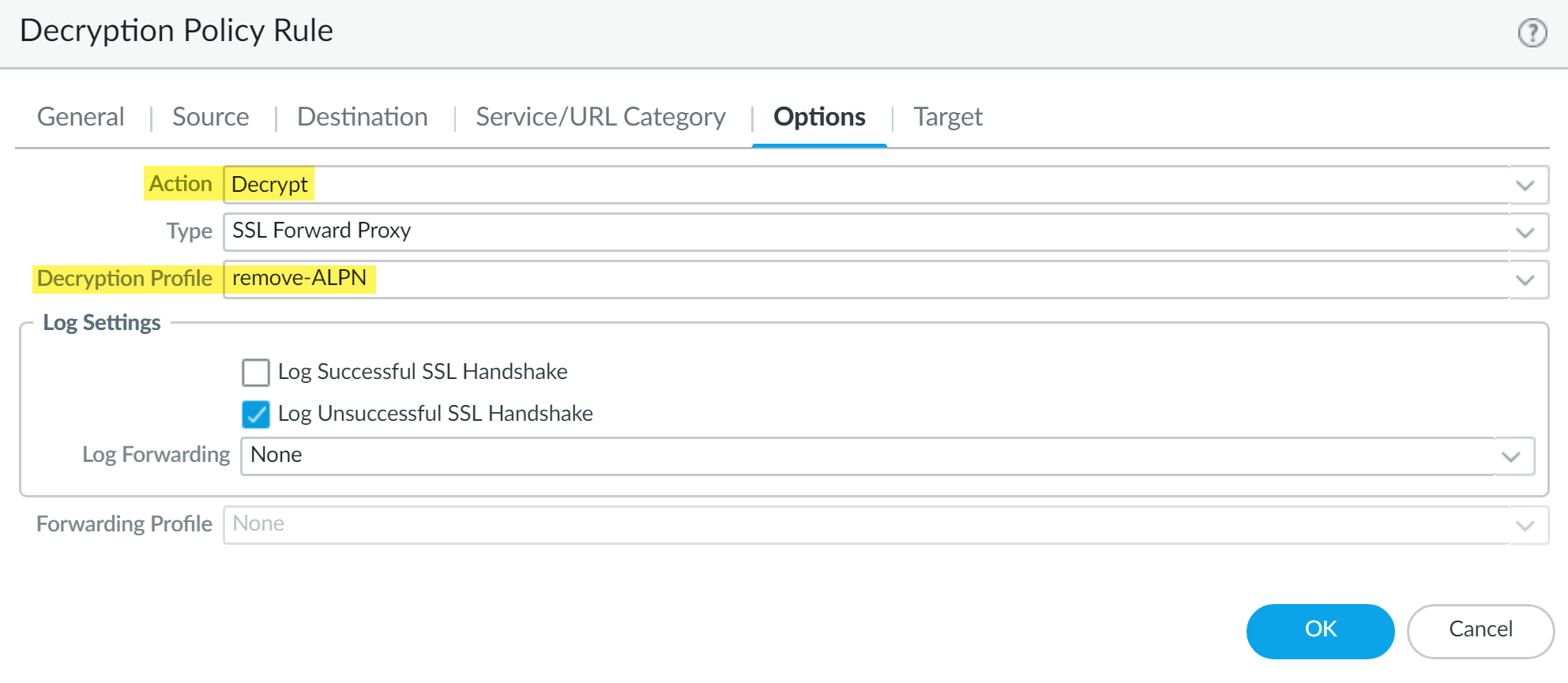 (Required for Enterprise DLP Plugin 3.0.1 and earlier releases only) Create a policy rule to remove ALPN headers from uploaded files.- Select PoliciesDecryption and specify the Device Group.Add a new decryption policy rule and configure as appropriate.Select Options.For the Action, select Decrypt.Select the Decryption Profile you created.Click OK.