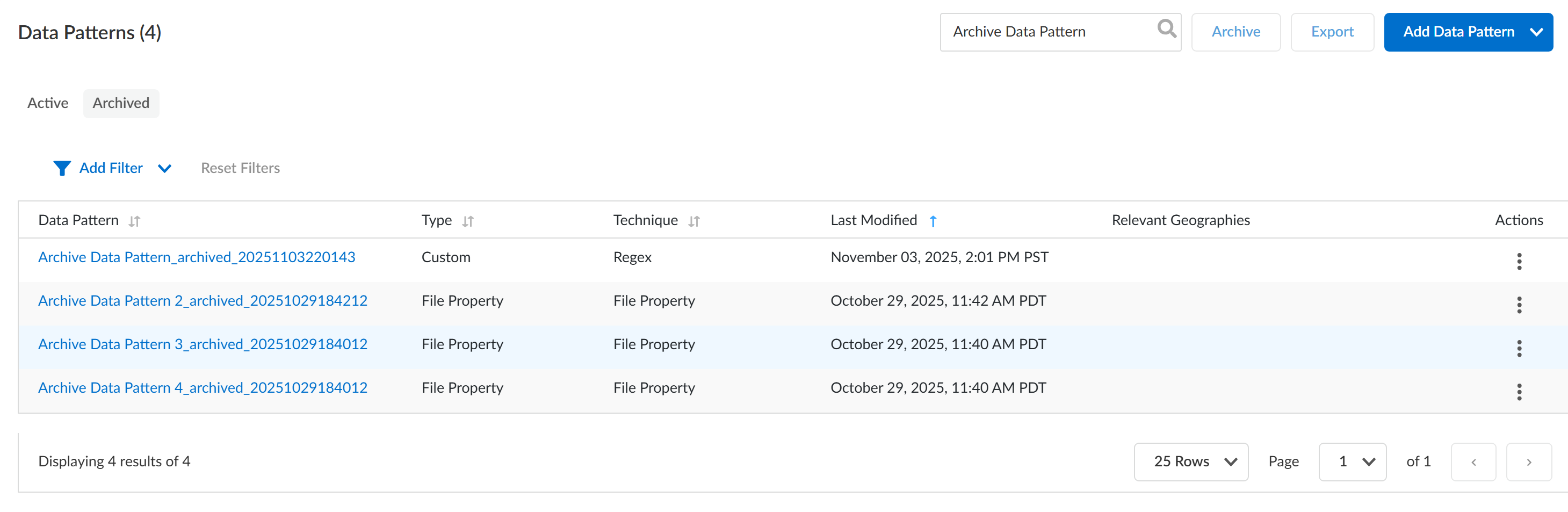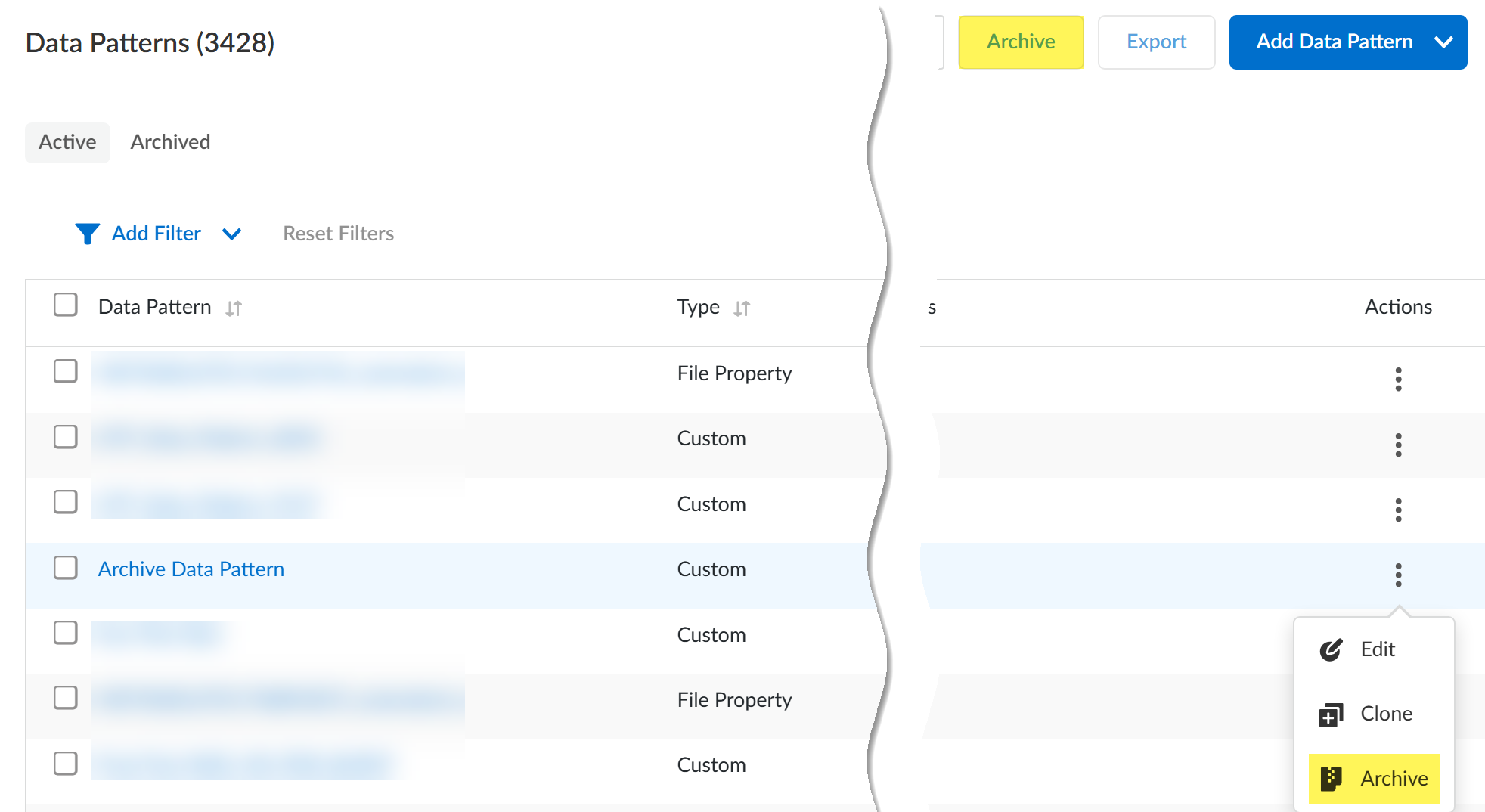 - Log in to Strata Cloud Manager.Create a custom or file property data pattern, or clone a predefined data pattern to custom match criteria.Enterprise DLP doesn't supporting archiving a predefined data pattern.Select ConfigurationData Loss PreventionDetection MethodsData Patterns.(Optional) In the Active data patterns, apply any filters or search for the data patterns you want to archive.Select one or more data patterns to Archive.