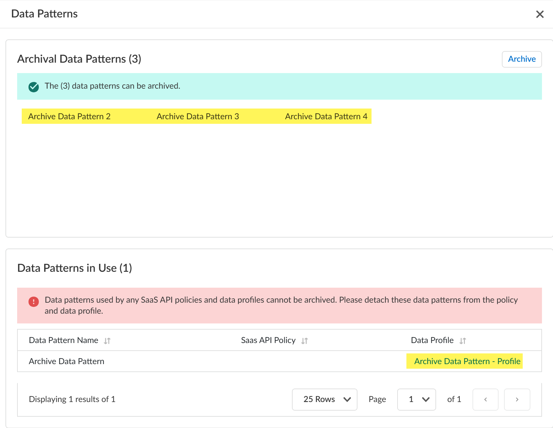 Resolve any data pattern in issues errors preventing archival Archive the selected data patterns.Skip this step to confirm the archival if none of the data patterns you selected are in use.Enterprise DLP prompts you with a list of the data patterns ready to archive and those currently in use if one or more data pattern are currently being used in a data profile or a Data Security (SaaS API) data asset policy rule.In the example below four data patterns are being archived. In this case, Archive Data Pattern 2, 3, and 4 aren't in use and are ready for archival. You can Archive these data patters. Continue to the next step to confirm the archival.However, the Archive Data Pattern is in use in the Archive Data Pattern - Profile data profile. Click the Data Profile name to navigate to the data profile so you can update and remove it. After removing Archive Data Pattern, you can select and archive the data pattern. Continue to the next step to confirm the archival.