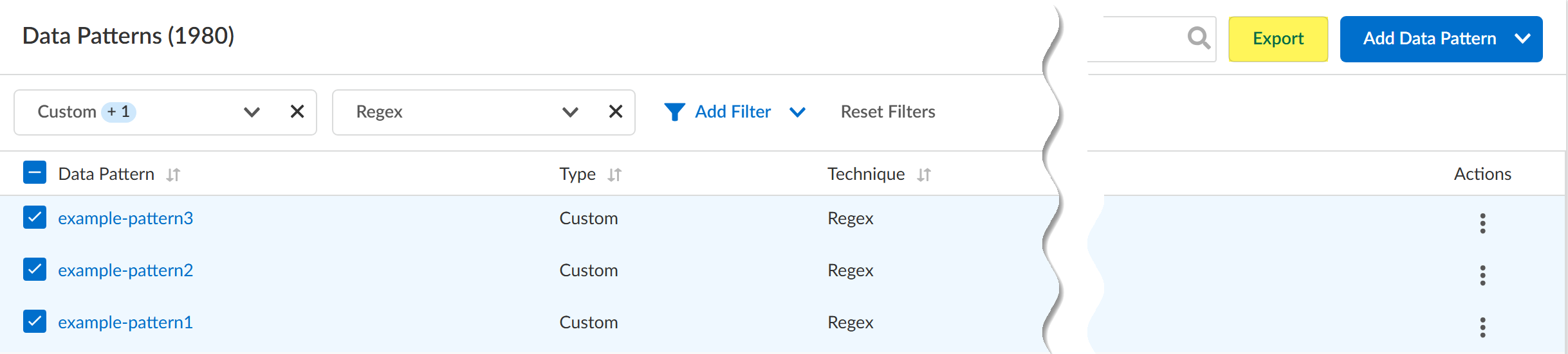 - Log in to Strata Cloud Manager.Navigate to the type of Enterprise DLP configuration object you want to export.You can export one type of configuration object at a time. For example, your data security administrator wants to import a specific set of data patterns, profiles, and data dictionaries. They must first navigate to your data patterns and export them, then navigate to your data profiles, and then to your data dictionaries.