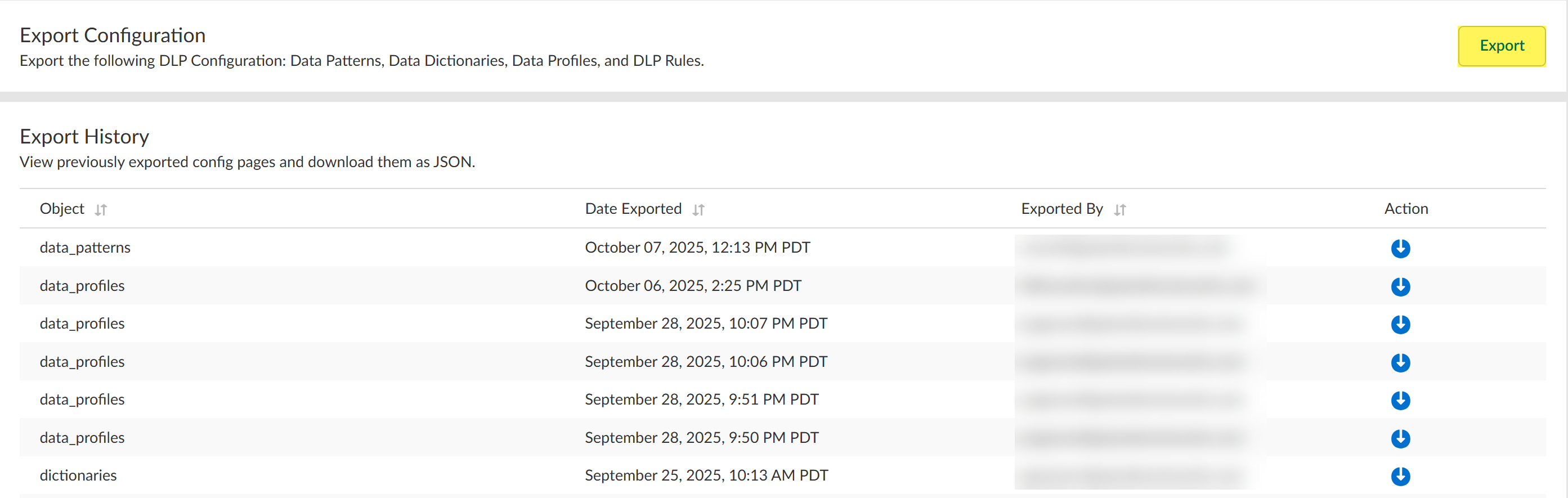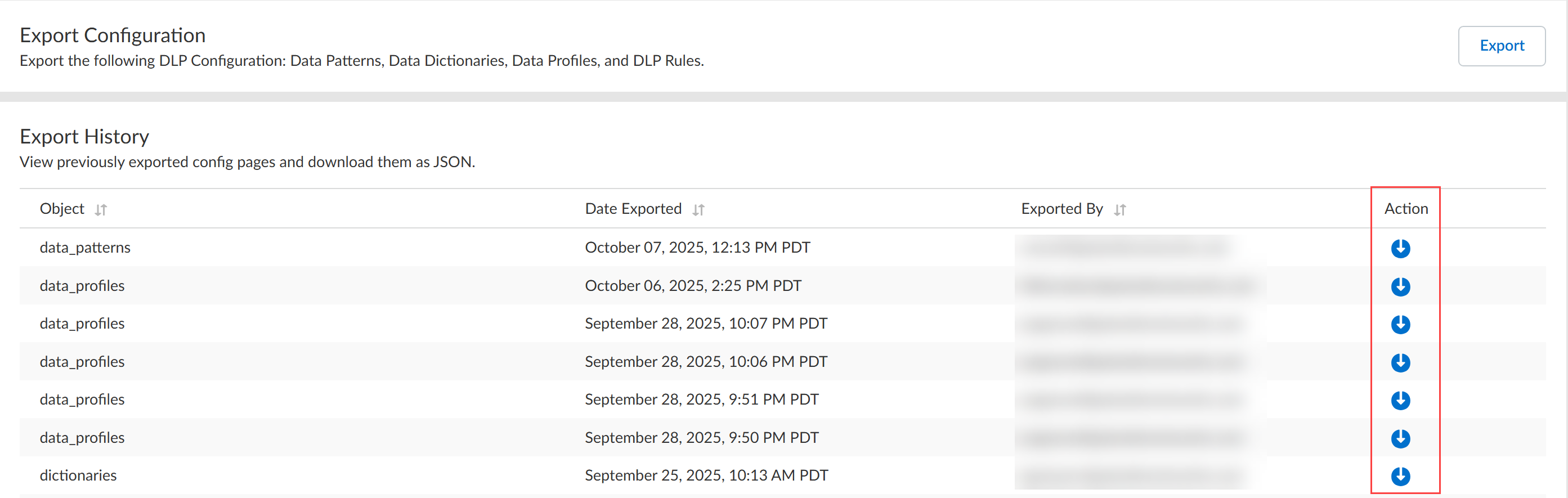 Review your Enterprise DLP Export History.You can use this page to audit all Enterprise DLP configuration object exports and to download previously exported Enterprise DLP configuration object exports.- Objects—Type of configuration object the data security administrator exported.