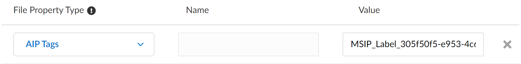 Only one AIP Tag entry is supported per data pattern. However, you can add up to 10 AIP tag values to an AIP Tag entry using ; as a separator. For example, MSIP_Label_305f50f5-e953-4c63-867b-388561f41989_Enabled:true; MSIP_Label_305f50f5-e953-4c63-867b-388561f41989_SetDate:2024-01-25T07:05:49Z; SIP_Label_305f50f5-e953-4c63-867b-388561f41989_Method:Privileged.