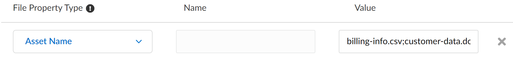 Only one Asset Name entry is supported per data pattern. However, you can add up to 100 asset name values to an Asset Name entry using ; as a separator:billing-info.csv;customer-data.docx;(?i)(\.*(ssn|password|pwd|security|credit|CCN|finance).*.