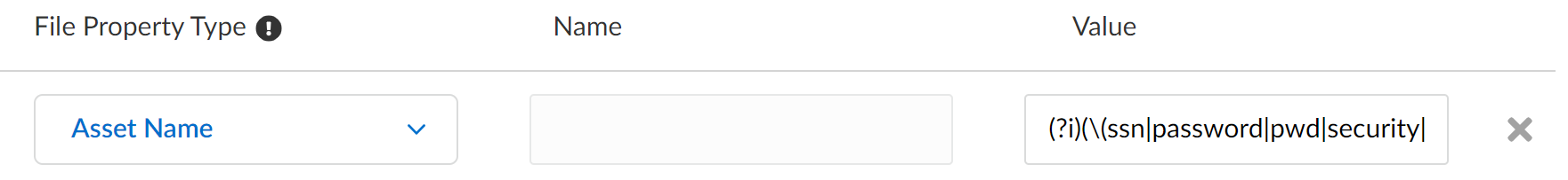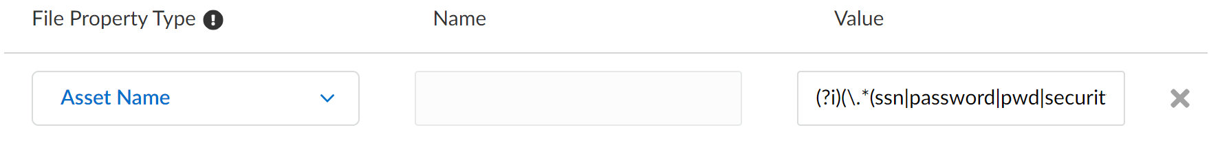 - Asset NameAsset names are the file name of files you want to prevent exfiltration. Asset names are case insensitive.Only one Asset Name entry is supported per data pattern. However, you can add up to 100 Asset Name values to an Asset Name entry using ; as a separator. Asset Names entries support plaintext and fully formed regex expressions for the Asset Name value. Asset Name is designed to inspect for a full word match. If a partial match is required, then the inclusion of a wild card character in the regular expression is required.