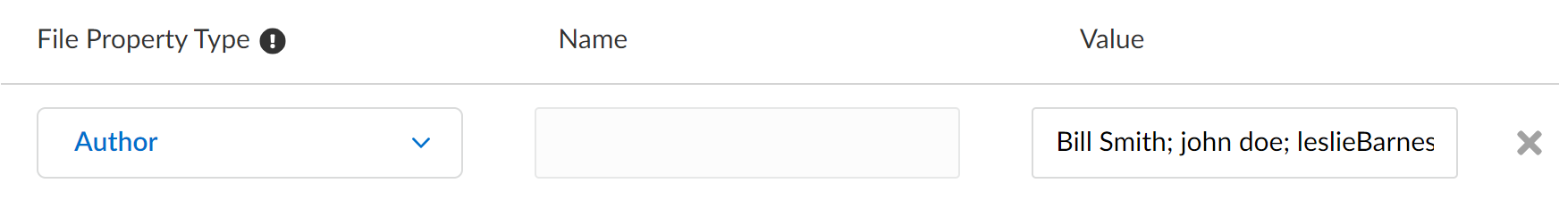 - AuthorFirst and last name of the file owner contained in the asset metadata. Author tags are case and space insensitive and only whole word matches are supported. No regex expressions or wildcards are supported.Only one Author entry is supported per data pattern. However, you can add up to 100 Author values to an Author entry using ; as a separator. For example, Bill Smith; john doe; leslieBarnes.The Author file property type is not supported for source code files.