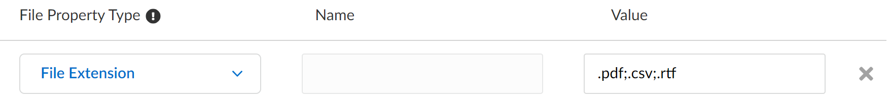 - File ExtensionSpecify one or more file types supported by Enterprise DLP. File Extension tags are case and space insensitive and only whole word matches are supported. Regex expressions and wildcards are not supported. To scan files based on a specific file extension, the file extension must be included in the file name.Only one File Extension entry is supported per data pattern. However, you can add up to 10 File Extension values to a File Extension entry using ; as a separator. For example, .pdf;.csv;.rtf.