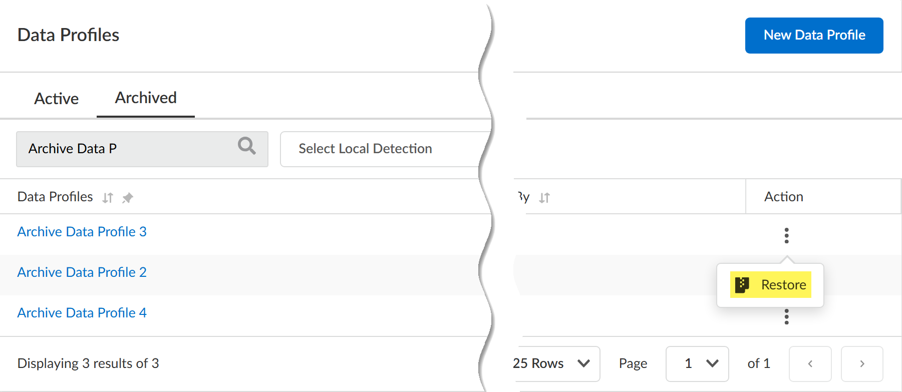 View your Active data profiles and verify that Enterprise DLP successfully restored the data profile.Remove any search terms if you filtered your Archived data profiles using a search filter.