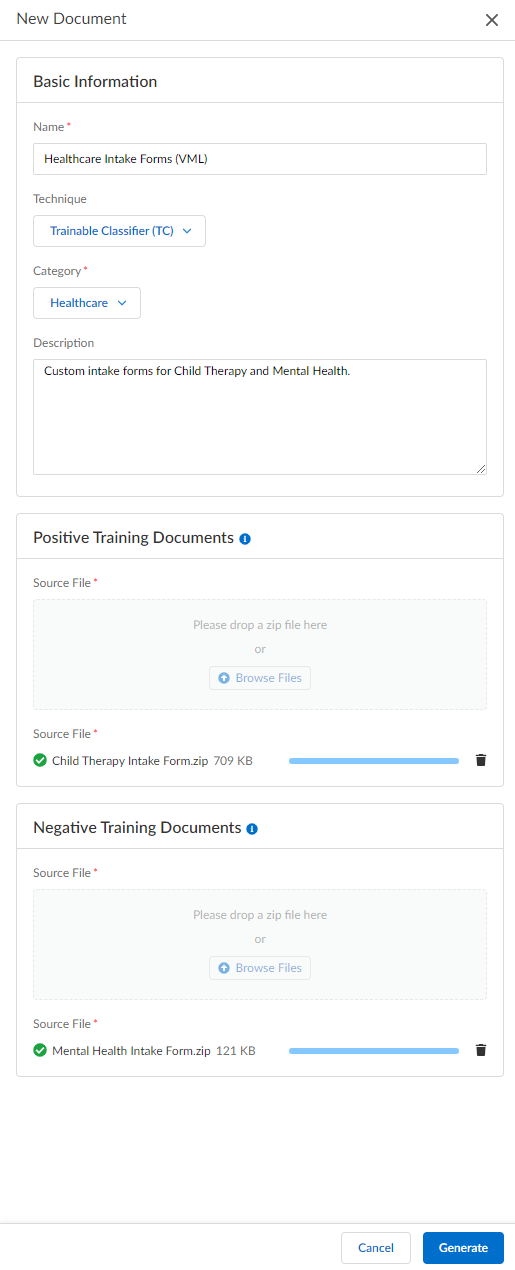 - Enter a Name for the custom document.For the Technique, select Trainable Classifier (TC).Select the document Category.Enterprise DLP uses the document category to group together similar types of documents for administrative purposes.You can specify one of the following predefined categories—Academia, Confidential, Employment, Financial, Government, Healthcare, Legal, Marketing, or Source Code.(Optional) Enter a Description for the custom document.Enterprise DLP supports up to 300 characters.Upload a .zip file for the Positive Training Documents and a .zip file for the Negative Training Documents.Enterprise DLP requires you add at least one positive and at least one negative training document.For the Source File for either, Browse Files to select the .zip file. Before you upload, review the upload requirements:
