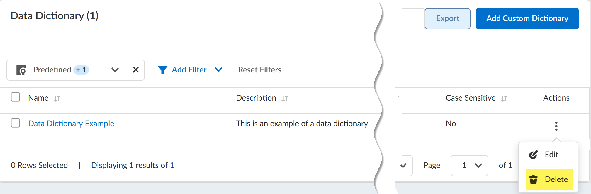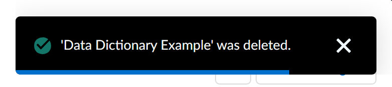 Select ConfigurationData Loss PreventionData Profiles to update the listed data profiles. Try deleting the data dictionary again after you've removed the data dictionary from the listed data profiles.Enterprise DLP displays a success message in the upper-right corner when the data dictionary was deleted.