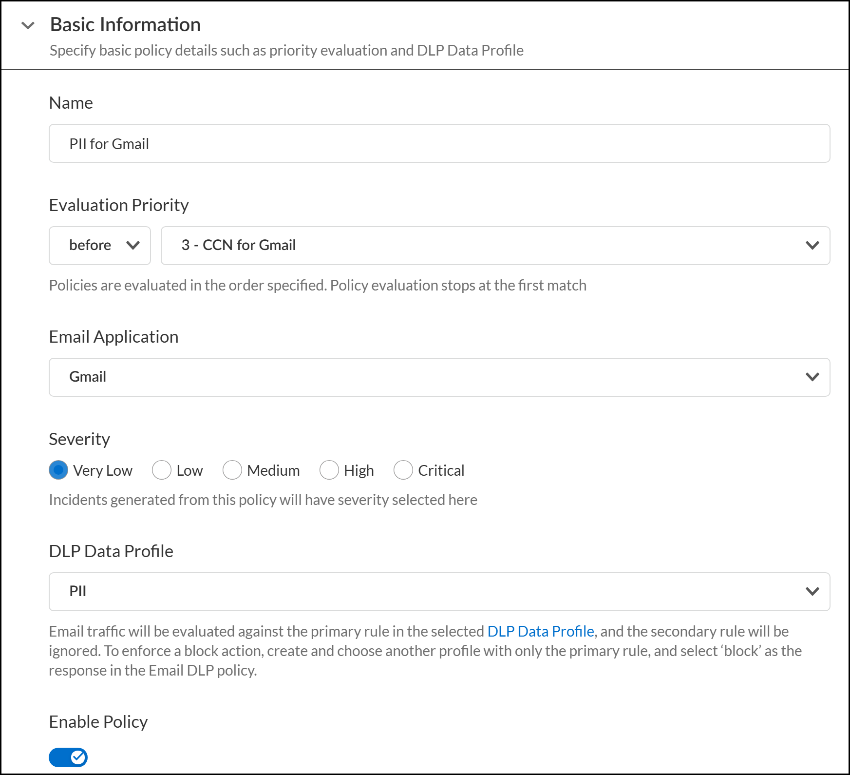 - For the Email Application, select Microsoft Exchange or Gmail.Select the Enterprise DLP incident severity for when Enterprise DLP detects matching traffic.Select the DLP Data Profile to associate with the Email DLP policy rule.The DLP data profile you select is used as the traffic match criteria that Enterprise DLP evaluates inspected traffic against. The data profile can be either a predefined data profile or a custom data profile.Verify that Enable Policy is toggled on.This setting is enabled by default when you add a new Email DLP policy rule.