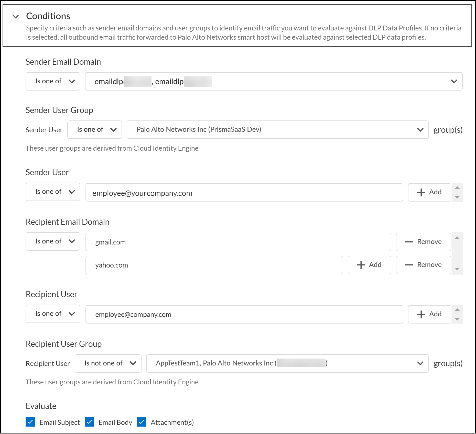 Configure the Email DLP policy rule Conditions.The Email DLP policy rule conditions determine the email sender and recipient criteria for when inline inspection of email traffic should or should not be performed by Enterprise DLP. The Email DLP policy rule conditions have an AND relationship. This means that all email sender and recipient Conditions you configure must be met for Enterprise DLP to take action.You can configure all or only some of the Email DLP policy rule conditions settings as needed. If no email sender or recipient conditions are configured, then all outbound email traffic is inspected by Enterprise DLP and evaluated against the data profile you selected in the previous step.For example, you configure the Email DLP policy rule conditions to inspect for the yourcompany.com Sender Email Domain and gmail.com Recipient Email Domain only. For Enterprise DLP to take action, the email sender domain and recipient email domain must match what you have configured. In this instance, Enterprise DLP does not take action if the Recipient Email Domain is yahoo.com.- Configure the email sender conditions.To configure the email sender conditions, you must specify whether the conditions are inclusive or exclusive of the specified email domains, user groups, or specific senders.
