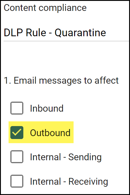 Configure the quarantine transport rule.- In the Content compliance field, enter a descriptive name for the transport rule.For the Email messages to affect, select Outbound.This instructs Gmail to forward the email to Enterprise DLP before it leaves your network when the email recipient is outside your organization.